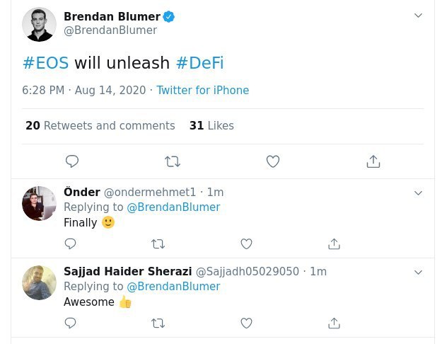 Брендан Блюмер пишет в твиттере, что #EOS спасёт #DEFI