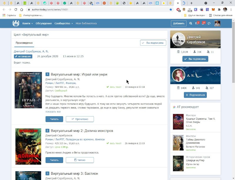 Сейчас читаю серию "Виртуальный мир" авторов Дмитрий Серебряков, A. N., страница которой на скрине.