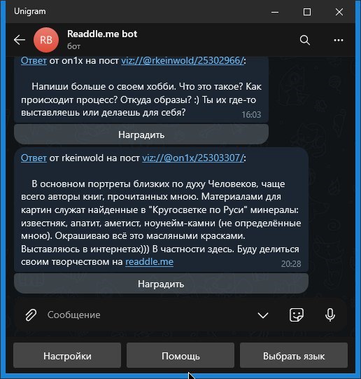 ΠΠΎΠ΄ Π±ΠΎΡΠ° ΠΎΡΠΊΡΡΡ, ΠΈ ΡΠ²Π»ΡΠ΅ΡΡΡ ΡΠ°ΡΡΡΡ viz-apps: https://github.com/denis-skripnik/viz-apps (ΠΏΠ°ΠΏΠΊΠ° jsmodules/readdlebot).