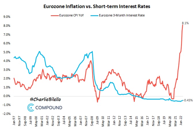 Инфляция в еврозоне поднялась до 8,1%, самого высокого уровня за всю историю