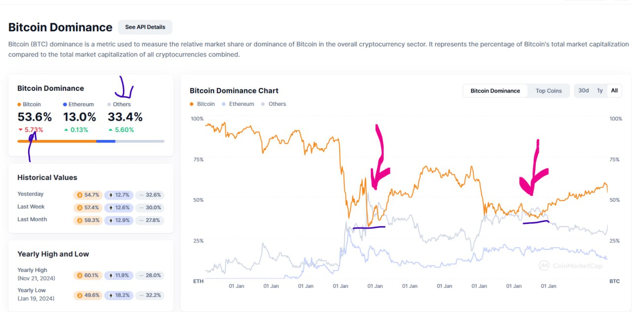 Привет всем! Замечена тенденция снижения доминации Bitcoin и увеличение Altcoin (активов)
